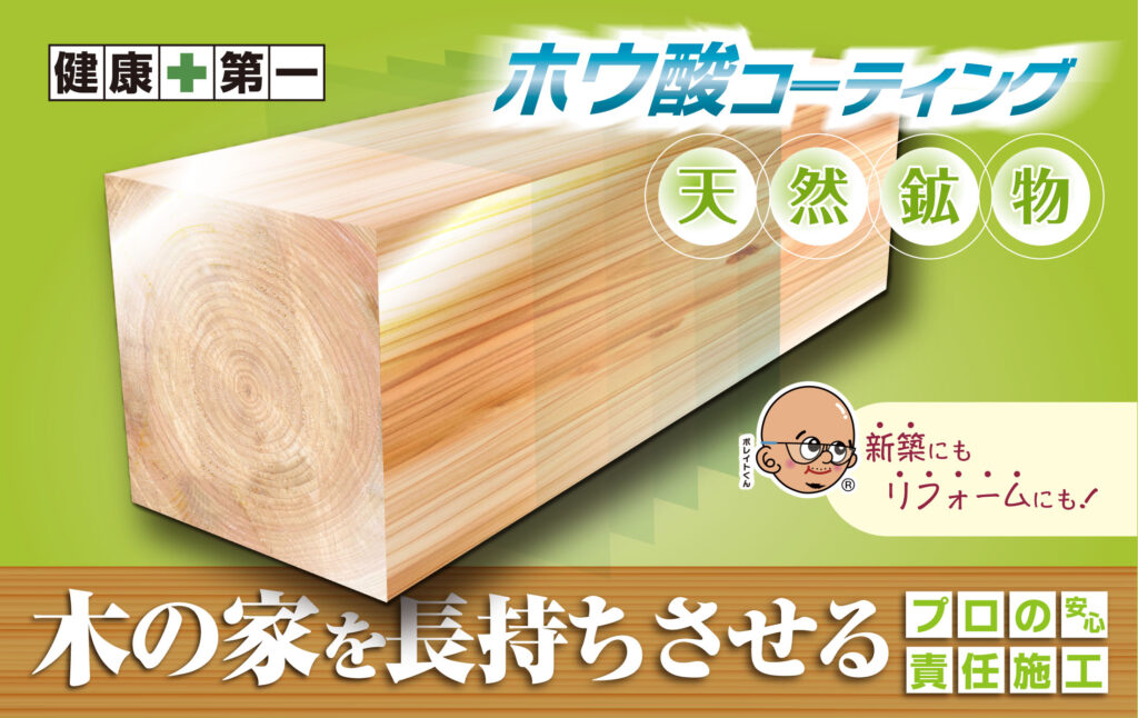 日本ボレイト株式会社は、自然素材の主成分ホウ酸を高濃度で木部に処理する特殊な技術開発により、合成殺虫剤では実現できなかった課題をクリアしました。